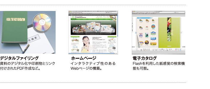 印刷と同時進行で印刷データをPDFに変換、CD-ROMに仕上げるのはもちろん、入稿されたデータのチェックからデータベースの構築、ホームページ作成まで、充実のデジタルサポートをご提供します。また、マイクロフィルムデータの扱いや大型図面のスキャニングなどに加えて、出力も承っています。